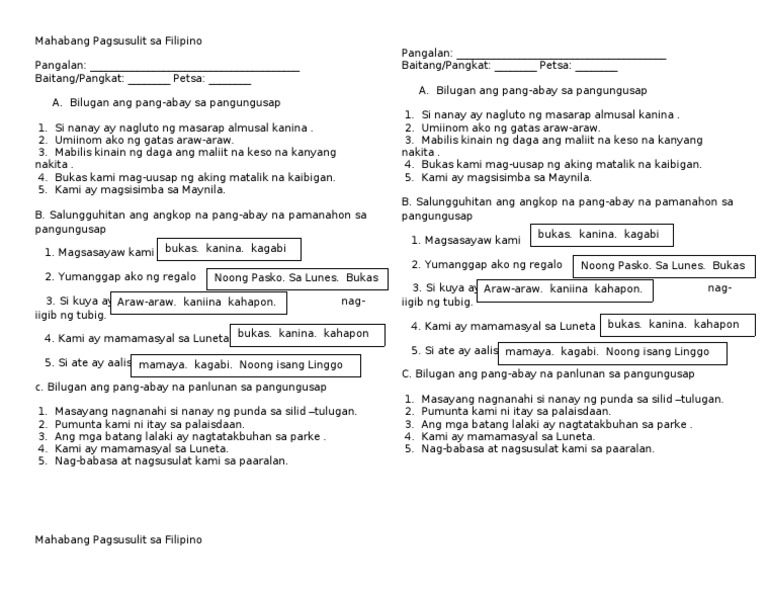 PAGSASALITA 1Nagagamit ang ibat ibang sugnay na pang-abay sa ibat ibang gawain sa pakikipagtalastasan. Tumutukoy din ito sa pook na pinangyarihan o pangyayarihan ng kilos sa pandiwa. These worksheets are appropriate for fifth or sixth grade students.