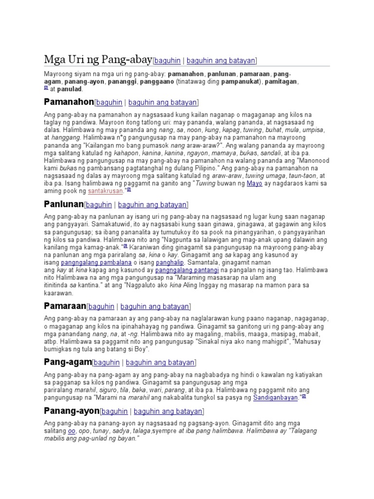 2014-01-04 The three kinds of pang-abay included in these worksheets are pang-abay na ingklitik enclitic particles pang-abay na panang-ayon adverbs of affirmation and pang-abay na pananggi adverbs of negation. Pang-abay na Panang-ayon Nagsasaad ng pagsang-ayon. Ang pang-abay ay isang salita or parirala na nagpabago ng kahulugan o katangian ng isang pang-uri pandiwa o isa pangkat ng salita.